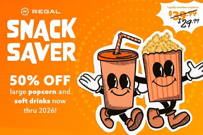 For a limited time, get the 2026 Snack Saver for just $29.99! Enjoy 50% off large popcorn and soft drinks all year long. Available for purchase in theatre only.